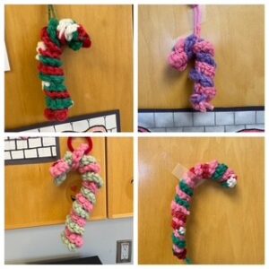 Each Monday in November, members of our Navan W.I., along with Chris MacPherson of the Navan Community Association, met at Heritage P.S. to teach the Grade 7/8 students how to crochet. It was exciting to see the finished designs!